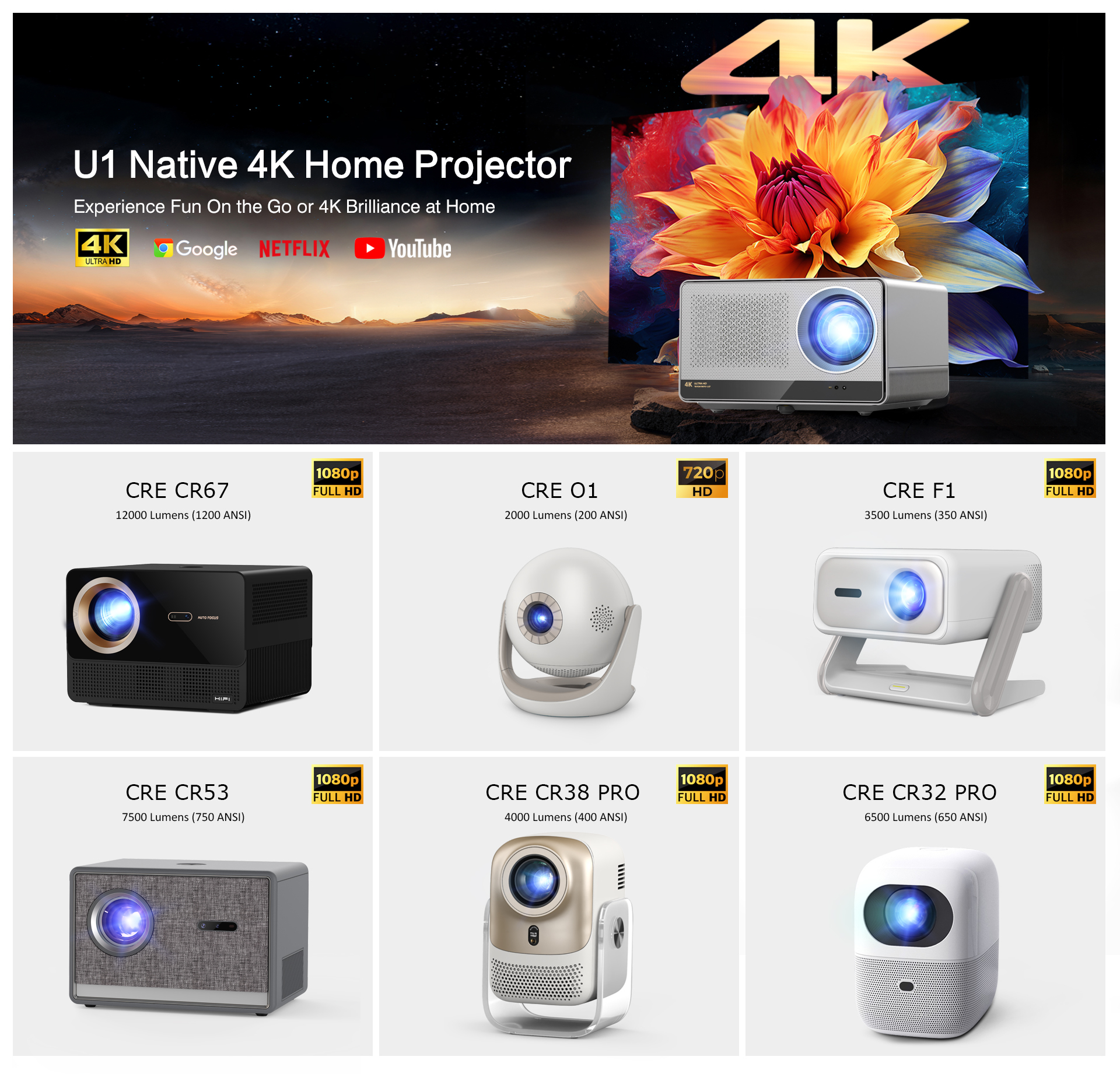 CRE U1 Native 4K 800ANSI Home Theater Projector Android 12 Auto Focus LED LCD Smart Video Home Cinema Projector